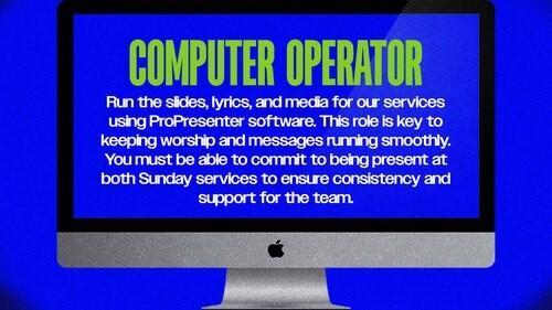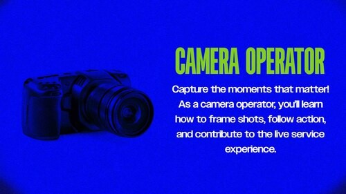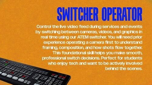 Join our media team and learn photography, video, lighting, all while serving your community and growing in your faith.